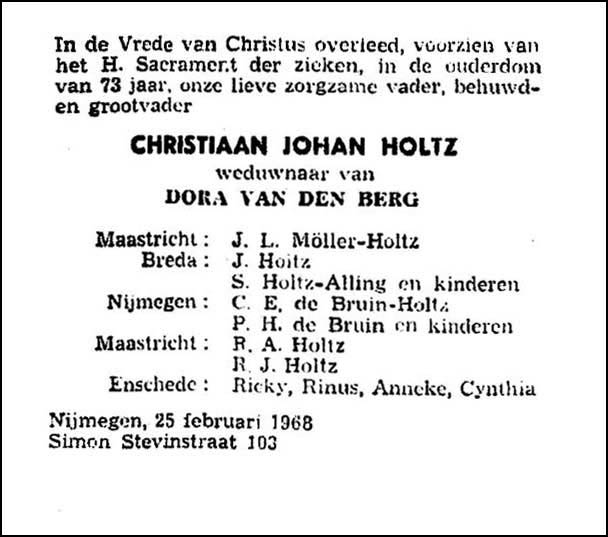 Christiaan Johan HOLTZ, geb. 14 aug 1894 te Tandjoeng Borneo, ovl. 25 feb 1968 te Nijmegen, zoon van Willem Frederik HOLTZ en RANTIJEM Chris was stationsklerk bij de Staatsspoorwegen in 1918. Hij woonde op dat moment samen met Dora van den Berg in Modjokerto. Ten tijde van het huwelijk van zijn zoon Max met Louise Schwidder (1946), was Chris stationschef bij de Staatsspoorwegen in Surabaja. Gestorven op 25 feb 1968 in Nijmegen. Woonde toen al jaren bij zijn dochter Meity de Bruin in de Simon Stevinstraat. Begraven in het familiegraf op het r.k. kerkhof 'Caberg' te Maastricht. Gehuwd 28 sep 1917 te Ngandjoek met: Dora VAN DEN BERG, geb. 29 aug 1898 te Ngandjoek, ovl. 13 sep 1957 te Maastricht. Woonde in 1949 in de Klerkstraat 14 te Surabaya. De ouders van Dora: Johan Frederik en Moortidja Woonden in 1951 in Bussum (Nederland). Documenten: Overlijdensakte Dora Overlijdensadvertentie Chris Bidprentje1 Chris Bidprentje2 Chris |