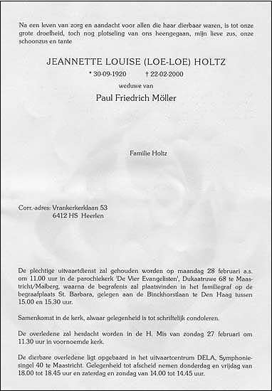 Paul Friederich MOLLER, geb. 20 nov 1912 te Jakarta, ovl. 4 jan 1967 te Den Haag, begr. 7 jan 1967 te Den haag. Begraven in het familiegraf op de r.k. begraafplaats 'St Barbara' te Den haag Gehuwd 28 mei 1946 te Surabaya met: Jeanette Louise HOLTZ, geb. 30 sep 1920 te Ngandjoek, ovl. 22 feb 2000 te Maastricht, begr. 28 feb 2000 te Den Haag 1e huwelijk, 2e huwelijk, dochter van Christiaan Johan HOLTZ en Dora VAN DEN BERG Woonde in 1949 in de Klerkstraat 14 te Surabaya. Gestorven om 09.30 uur te Maastricht Begraven in het familiegraf op de r.k. begraafplaats 'St Barbara' te Den haag Documenten: Geboorteakte Doopakte Trouwakte Overlijdensakte Bidprentje Loeloe Diploma Op 6 juni 1937 diploma uitgereikt: Wilhelminaschool 3-jarige HBS voor meisjes der religieuzen Ursulinen te Surabaya. Cyferlijst: Godsdienst 8 Nederlands 6 Frans 5 Engels 4 Duits 6 Aardrijkskunde 7 Geschiedenis 7 Wiskunde 5 Boekhouden of hygiene 9 Natuurkennis 6 Natuurkunde 4 Tekenen 8 Schrijven 6 Handwerken 6 Gymnastiek 7 |