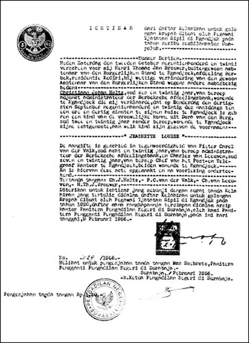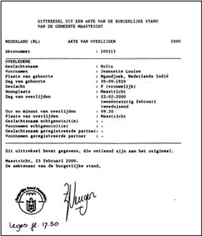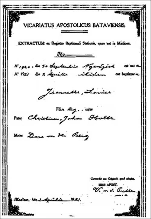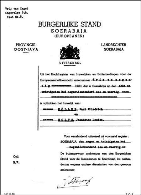 Paul Friederich MOLLER, geb. 20 nov 1912 te Jakarta, ovl. 4 jan 1967 te Den Haag, begr. 7 jan 1967 te Den haag. Begraven in het familiegraf op de r.k. begraafplaats 'St Barbara' te Den haag Gehuwd 28 mei 1946 te Surabaya met: Jeanette Louise HOLTZ, geb. 30 sep 1920 te Ngandjoek, ovl. 22 feb 2000 te Maastricht, begr. 28 feb 2000 te Den Haag 1e huwelijk, 2e huwelijk, dochter van Christiaan Johan HOLTZ en Dora VAN DEN BERG Woonde in 1949 in de Klerkstraat 14 te Surabaya. Gestorven om 09.30 uur te Maastricht Begraven in het familiegraf op de r.k. begraafplaats 'St Barbara' te Den haag Documenten: Geboorteakte Doopakte Trouwakte Overlijdensakte Bidprentje Loeloe Diploma Op 6 juni 1937 diploma uitgereikt: Wilhelminaschool 3-jarige HBS voor meisjes der religieuzen Ursulinen te Surabaya. Cyferlijst: Godsdienst 8 Nederlands 6 Frans 5 Engels 4 Duits 6 Aardrijkskunde 7 Geschiedenis 7 Wiskunde 5 Boekhouden of hygiene 9 Natuurkennis 6 Natuurkunde 4 Tekenen 8 Schrijven 6 Handwerken 6 Gymnastiek 7 |
