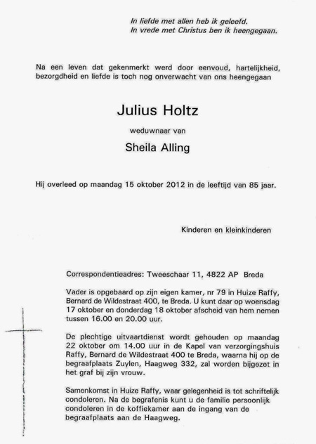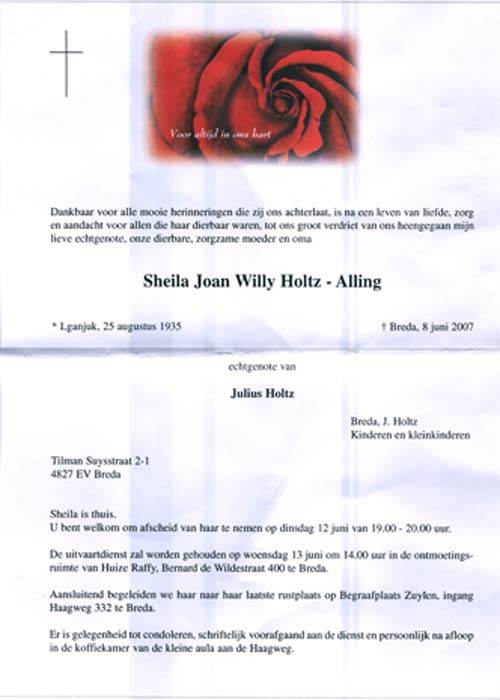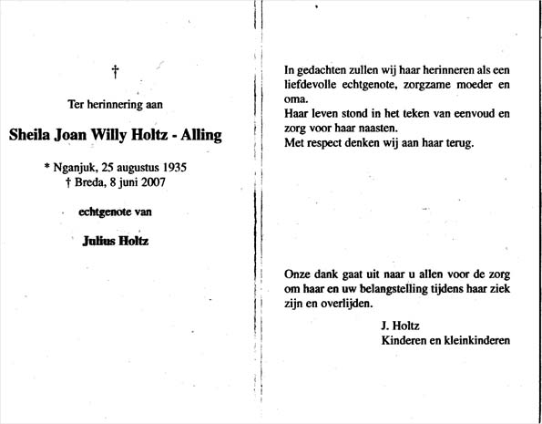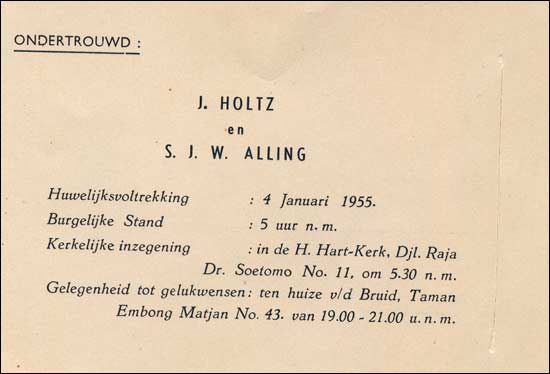 Julius HOLTZ, geb. 12 apr 1927 te Malang, ovl. 14 okt 2012 te Breda, zoon van Christiaan Johan HOLTZ en Dora VAN DEN BERG Roepnaam Bolly Gehuwd 4 jan 1955 te Surabaya met: Sheila Joan Willy ALLING, geb. 25 aug 1935 te Ngandjoek, ovl. 8 jun 2007 te Breda Burgelijke stand om 17.00 uur. Kerkelijke inzegening in de Heilige Hart Kerk, Jalan Raja dr. Soetomo 11 om 17.30 uur. Echtpaar woonde op de Taman Embong Matjan 43 Documenten: Trouwkaart Bidprentje Sheila Overlijdenskaart Sheila Bidprentje Bollie Overlijdenskaart Bollie |