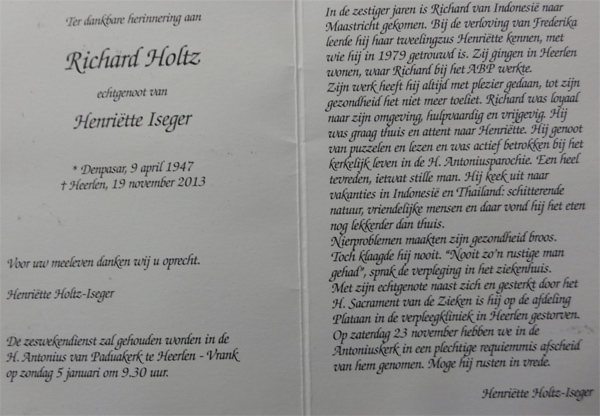 1) Richard Arthur HOLTZ, geb. 9 apr 1947 te Den Pasar Bali, ged. 27 apr 1947 te Den Pasar Bali, ovl 19 nov 2013 te Heerlen.