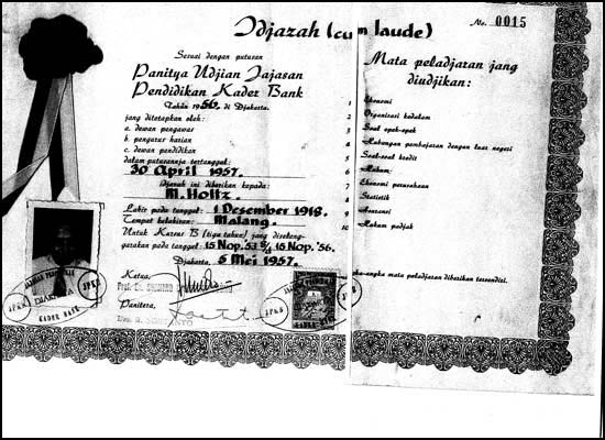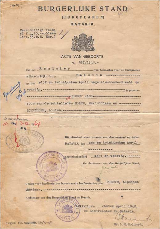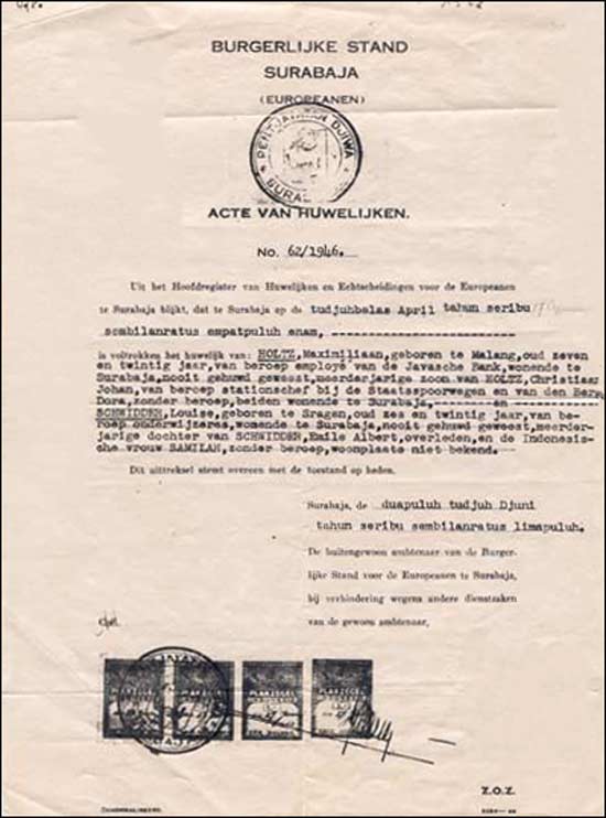 Gehuwd 17 apr 1946 te Surabaja met: Louise SCHWIDDER, geb. 6 sep 1919 te Sragen, ovl. 7 oct 1949 te Batavia Louise wordt Wies genoemd. Haar ouders zijn Emile Albert Schwidder en de Indonesische vrouw Samilah. Op haar 26ste trouwde Wies met Max Holtz. Haar vader was toen al overleden. Documenten: Geboorteakte Diploma Trouwakte Overlijdensakte | ||||||||||||