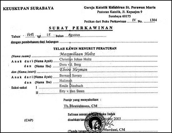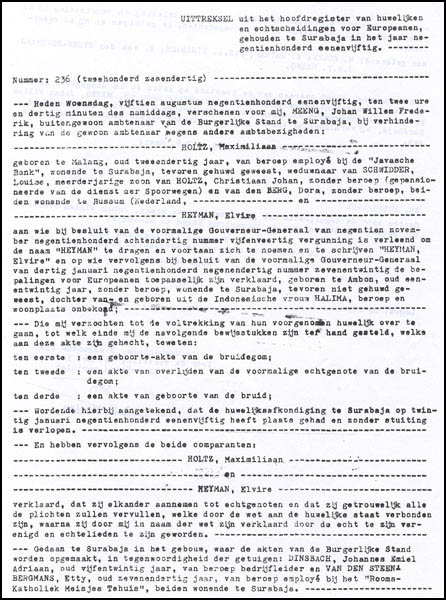 Gehuwd 15 aug 1951 te Surabaja met: Elvire HEYMAN, geb. 27 jul 1930 te Ambon, ovl. 4 nov 2021 te Enschede 1e huwelijk, 2e huwelijk Trouwde op 21-jarige leeftijd met Max Holtz. Heeft bij besluit van de voormalige Gouverneur-Generaal op 19 nov 1938 vergunning verkregen om de naam Heyman te dragen en voortaan zich te noemen en te schrijven Heyman Elvire. De bepalingen voor Europeanen is voor Elvire van toepassing sinds 30 jan 1939. Is dochter van en geboren uit de Indonesische vrouw Halima, beroep en woonplaats onbekend. Max en Els trouwden op 15 aug 1951 om 14.40 te Surabaja. Het huwelijk werd voltrokken door Johan Willem Frederik Meeng. De ouders van Max (Chris en Dora) woonden toen in Bussum. Geuigen waren : Johannes Emiel Adriaan Dinsbach (25 jaar), bedrijfsleider en Etty van den Steen Bergmans (37 jaar) van beroep employee bij het Rooms Katholieke Meisjes Tehuis te Surabaja. Documenten: Surat Permandian Surat Keterangan Surat Perkawinan Trouweakte | ||||||||||