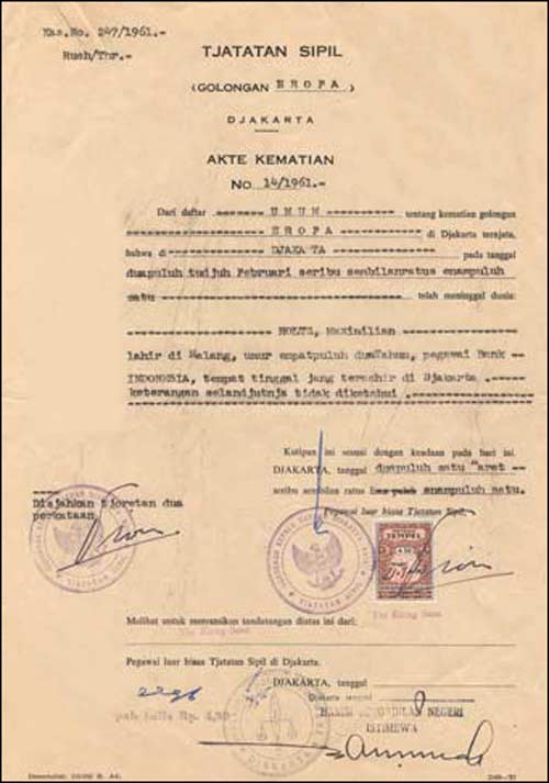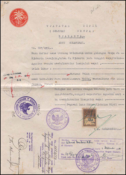 Geboorteakte werd opgesteld door de buitengewoon ambetenaar van de Burgelijke Stand dhr. Ahmad Badaruddin op 2 september 1954.