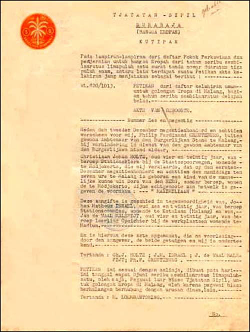 De geboorteakte werd opgesteld door Philip Ferdinand Creutzberg (buitengewoon ambtenaar van de Burgelijke Stand te Malang). De aangifte is geschied in tegenwoordigheid van Joseph Matheus Israel (26 jaar), van beroep Stationscommies, wonende te Kotalama (Malang) en van Jan de Waal Malefijt (24 jaar), leerling Opzichter bij de werkplaatsen, wonende te Madiun.