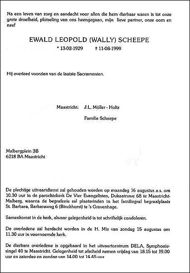 Ewald Leopold SCHEEPE, geb. 13 feb 1929 te Dampit, ovl. 11 aug 1999 te Maastricht, begr. 16 aug 1999 te Den Haag. Begraven in het familiegraf op de r.k. begraafplaats 'St Barbara' te Den haag met: Jeanette Louise HOLTZ, geb. 30 sep 1920 te Ngandjoek, ovl. 22 feb 2000 te Maastricht, begr. 28 feb 2000 te Den Haag 1e huwelijk, 2e huwelijk, dochter van Christiaan Johan HOLTZ en Dora VAN DEN BERG Documenten: Bidprentje Wally |